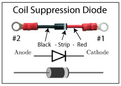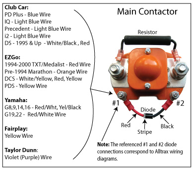 The coil suppression diode goes across the small poles. It is directional and will be ruined if installed incorrectly. On one side of the diode is a silver stripe. It should have a red heat shrink on the same side, shown as #1 at right. The striped side of the diode must connect to the same side of the small coil connections on the contactor as the color wires referenced below for your vehicle. If these wires have been changed, or you have a different type of cart, the stripe side of the diode will be on the hot side of the circuit, or the key side. The other side runs to battery negative.