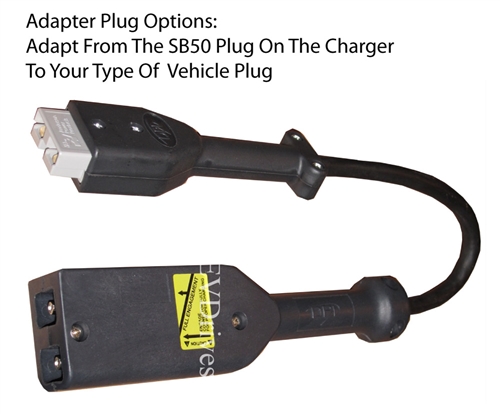 The charger comes with an SB50 plug on the DC side, and you can choose an adapter plug that goes from SB50 to any of the options below.