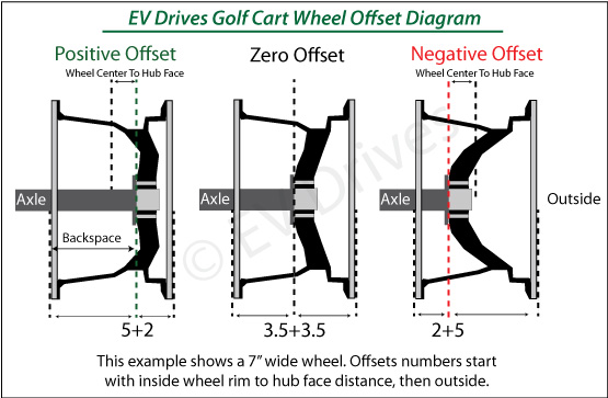 When you are getting ready to buy some new wheels for your golf cart, make sure your wheels have the correct offset. What is wheel offset? The offset is a measurement of the distance from where the axle bolts to the inside of the wheel to the back side of the wheel rim.