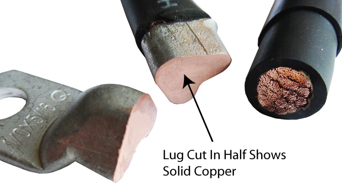 All of our cable kits have solid copper tinned lugs that are crimped instead of soldered. Correctly crimped, the copper lug and wire become fused into one piece of metal. Tests show that crimping (VS soldering) is stronger and longer lasting under tension and heat. The aerospace industry uses crimping, as does Siemens motors.